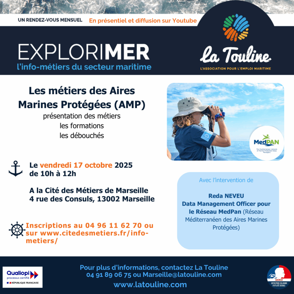 Le prochain rendez-vous ExploriMer portera sur les métiers des aires marines protégées. Rendez-vous dans l’amphithéâtre de la Cité des Métiers à Marseille le vendredi 17 octobre prochain de 10h à 12h.
