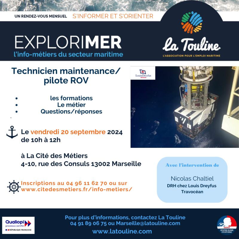 A Marseille au sein de la Cité des Métiers de Marseille et de Provence-Alpes-Côte d’Azur nous parlerons des métiers de technicien maintenance, pilote de ROV. Nous aurons le plaisir d’accueillir comme intervenant Nicolas CHALTIEL de LOUIS DREYFUS TRAVOCEAN.